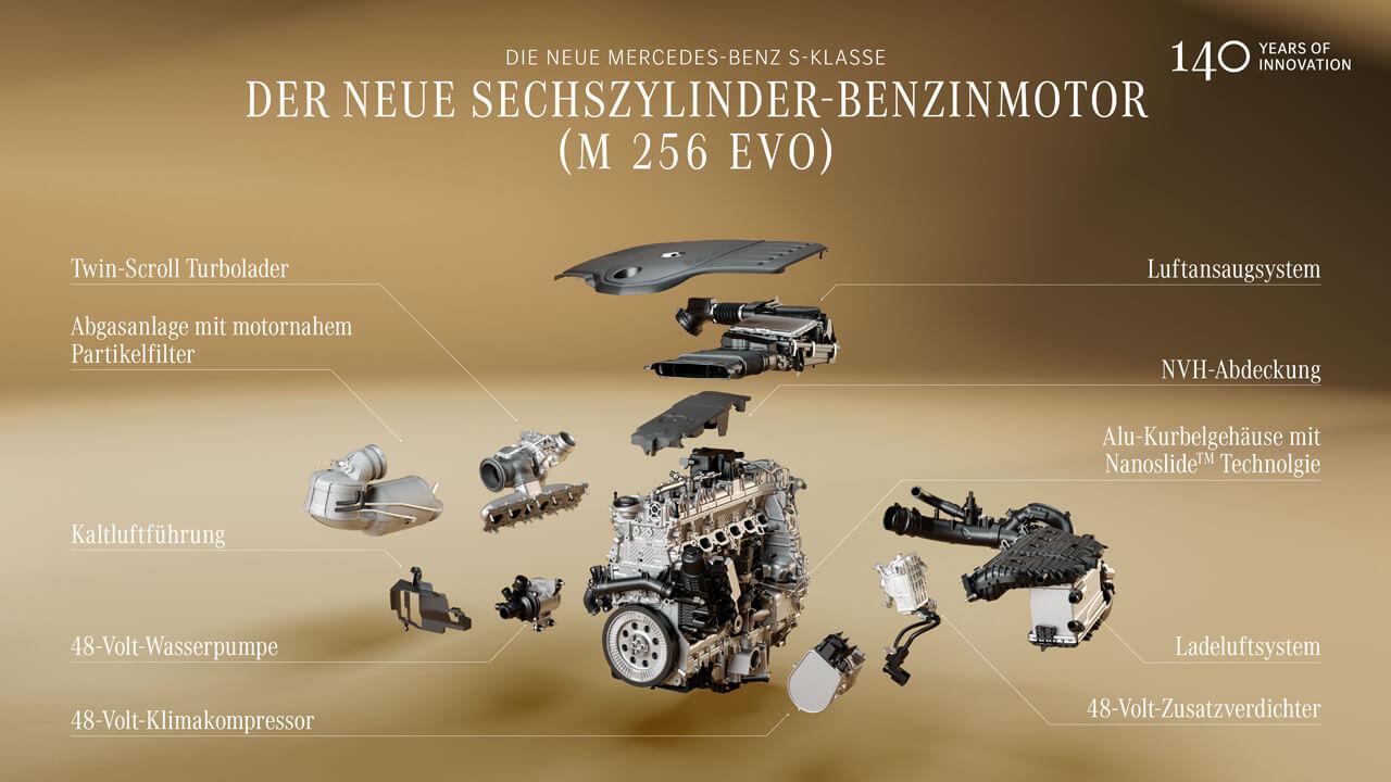 A motorpaletta csúcsán az S 580 4MATIC rendkívül nyugodt járású, 537 lóerős nyolchengerese áll, enyhe-hibrid technikával és energia-visszatáplálással. Az S 500 4MATIC és az S 450 4MATIC hathengeres benzinesét még dinamikusabb reakciók és röviden kihasználható overboost-funkció jellemzi. Erőteljes elektromos motorral kombinálva, az EQ Hybrid technikával már plug-in hibrid változatban kínál akár 100 kilométer tisztán elektromos hatótávot. A dízelrajongók az S 450 d 4MATIC és az S 350 d 4MATIC közül választhatnak, egyaránt az új, elektromos fűtésű katalizátorral. Mindegyik erőforrást integrált indítógenerátor (ISG) segíti alacsony fordulaton.